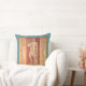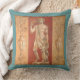 travesseiro decorativo de 20" x 20" com uma imagem de Dionísio, deus do vinho e do fazer de vinho, e uma loucura ritual, colocada no vermelho segurando uma taça de uvas entre duas urnas decorativas no ouro. Teal para trás. Veja toda a coleção de Travesseiros Toga no DECOR | Seção Travesseiros.