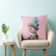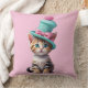 Um gatinho fofo com olhos azuis brilhantes está vestindo um chapéu colorido, branco, tocado com um grande pom. Seu pelo apresenta uma mistura de cor laranja, branca e pistas de cores pastéis, dando-lhe uma aparência lúdica e encantadora. Fundo rosa