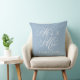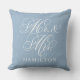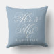 Travesseiro de sotaque quadrado elegante para casais felizes e recém-casados apresenta um roteiro branco, Sr. e Sra. design, com um texto monográfico personalizado que pode ser personalizado com o sobrenome casado. A cor azul de fundo da cinza empoeirada pode ser personalizada para coordenar com as cores de decoração da sua casa ou do seu quarto.