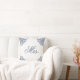 Esta almofada elegante branca e azul com a palavra Sra. em escrita é um produto correspondente para fazer um conjunto de duas almofadas para os recém-casados. É uma decoração de casa bonita que apresenta mandalas floridas nos cantos. Decore o quarto, sala de estar ou outros espaços de convivio com estilo. Este design é uma boa ideia para uma decoração de casa de campo moderna ou como parte de um estilo boho chic.