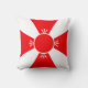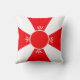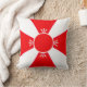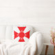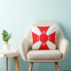 Elegante almofada vermelha e branca. Uma cruz vermelha é formada por quatro triângulos e um círculo decorado com penas de três folhas.