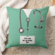 Travesseiro de enfermeira personalizado com esfregões hospitalares, um estetoscópio e uma engraçada faca suíça. Editar texto para adicionar nome e credenciais profissionais.
