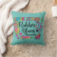 O travesseiro decorativo de design de enfermeira colorido apresenta coloração de gravata e cores legal estetoscópio, corações, agulha hipodérmica e café com texto colorido que lê Esfregões de Café e Luvas de Borracha!