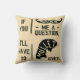 O humor engraçado e clássico do meme "Eu lhe dou uma pergunta" é levado a um novo nível com este hilário travesseiro decorativo de trocadilhos. "Se você me ensinar uma pergunta," diz ele, "Eu vou ter que fazer uma parada." O travesseiro tem uma fotografia de um bigode e cabelo de pastilha desencarnados em fundo de cor pergaminho. Aproveite esta design alegre e divertida que é tudo negócio na frente e festa atrás.