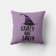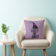 Travesseiro decorativo temático do Dia das Bruxas roxo com "Dama do Chapéu Louco" e chapéu de bruxas.
