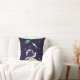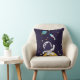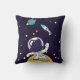 Travesseiro com um fundo azul escuro com estrelas amarelas espalhadas ao redor. Camadas sobre o topo é uma ilustração de um homem espacial vestindo um traje astronauta branco flutuando sobre a lua. Ao acenar olá enquanto explora espaço. Ao longe está um planeta com anéis e um foguete voando para o espaço.