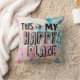 Este é o meu Travesseiro de Lugar Feliz, com o histórico de espiral colorida com o ditado "This Is My Happy Place" na frente.
