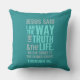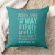 Travesseiros decorativos com o verso bíblico de John 14:6 Jesus lhe disse, "Eu sou o caminho, a verdade, e a vida. Ninguém pode vir ao Pai exceto por mim". Os versos estão em cores pastéis azuis e em caligrafia mista e tipografia minimalista. Esta moda, design de fé moderna é a dádiva perfeita e a declaração de moda. #cristão #religião #escritura #fé #bíblia #jesus