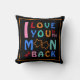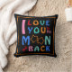 Eu te amo na lua e de volta na frente deste travesseiro com uma borda laranja contra um pano de fundo preto. Palavras inspiradoras para a família e os amigos! Faz um presente de excelente.