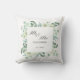Este travesseiro decorativo apresenta uma espessa borda de verde-luxuoso, eucalipto e flores verdes claras. O design oferece um script elegante para "Sr. & Sra." e texto personalizado para o nome. Este é um presente perfeito para qualquer novo casal.