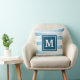 Estilo costeiro, travesseiro decorativo temático náutico com um padrão listrado, pintado à mão, com intempérie, azul e branco, com um marinho de quadrado monográfico branco e azul no centro. O verso é um marinho azul sólido. Perfeito para decoração temática de Natal costeiro ou para adicionar estilo de praia a qualquer momento do ano.