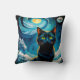 Throw pillow with a fantasy illustration of a black cat against a full moon and blue sky.