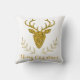 Este travesseiro festivo apresenta uma bela imagem da forma falsa de folha de ouro texturizada de cervo com algumas ramificações de árvores. Há também uma área de texto personalizável que diz agora "Feliz Natal". Notem: A textura da folha de alumínio não é real. É uma imagem impressa imitando a aparência da folha de ouro.
