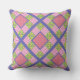 Um Travesseiro decorativo de chic ou Cushion, com um padrão bonito de falso-patchwork de primatas cor-de-rosa profundo, azuis violeta e amarelas sobre um fundo verde-folha, com gingham e bolinhas; cor-de-rosa e branco profundos, da coleção "Primroses" Posh & Painterly.