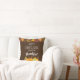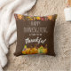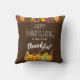 Um travesseiro que diz: Feliz Dia de Ação de Graças, um momento para agradecer. Ilustração aquosa de abóboras, bolotas, cogumelos e folhas sazonais de outono. Uma fronteira ao longo do topo também composta por folhas do outono, bagas, bolotas e outras folhagem.