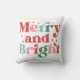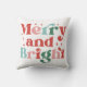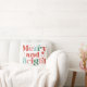 O texto do estilo retrô lê Feliz e Brilho neste travesseiro decorativo de Natal colorido.