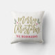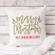 O design de travesseiro sazonal apresenta um antigo e moderno roteiro dourado "Feliz Natal" com texto vermelho personalizado que pode ser personalizado com seu sobrenome. Ramos verdes de folhas sagradas e bagas vermelhas acendem a design. Cor de fundo branca.