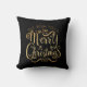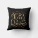 "Desejamos-lhe um Feliz Natal". Linda tipografia dourada no travesseiro decorativo de fundo preto. Tão elegante e chique para o seu decoro de férias. Imaginem isto com travesseiros de ouro falsos. Uau!