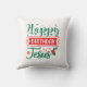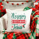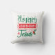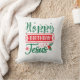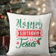 Feliz Aniversário, Jesus travesseiro decorativo em cores festivas vermelhas e verdes de feriado com sotaque de sotaque sagrado e floco de neve.