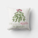 Esta design apresenta um belo e belo travesseiro de Natal com um roteiro de caligrafia na moda, branco e verde, folhas de folhagem verde de inverno, bagas holandesas botânicas, letra de tipografia minimalista, presente de humor engraçado e engraçado, decoração caseira bonitinha de Natal, "conheça-me sob o mistério", elegância elegante e simplista criativa e simplista