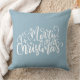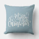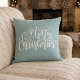 Travesseiro azul-claro e bonito no estilo da fazenda rural. "Feliz Natal" cita texto escrito como caligrafia. Localizar mais itens correspondentes na minha coleção "Natal em vermelho, azul e branco"