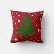 Feliz Árvore de Natal é uma design de arte gráfica. O fundo é uma cor vermelha sólida com bolas de neve brancas texturizadas. No centro está uma árvore de Natal verde. No fundo está o texto decorativo de ouro que diz: Feliz Natal. As bordas externas têm uma pequena borda de diamantes verdes e uma coisa de borda dourada. A parte de trás do travesseiro é uma bola de neve vermelha e branca sem a árvore e o texto dourado.
