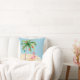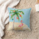 Árvore de Palma de Natal decorada e um flamingo em um chapéu de Papai Noel no travesseiro decorativo de praia para sua festa de Natal tropical ou decoração domiciliar.