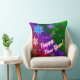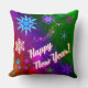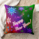 travesseiro decorativo de 20" x 20" com uma imagem de bonito azul, flocos de neve fuchsia e verde sobre um fundo arco-íris de luzes de férias. Sentimento de feriado branco. Roxo para trás. Consulte a coleção inteira de Travesseiros de Ano Novo na categoria HOME na seção HOLIDAYS.
