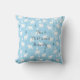 Travesseiro decorativo de Natal personalizado com ursos polares bonitos com flocos de neve em queda em um fundo azul de gelo com o nome da família e o ano em uma fonte clássica de cinza azul. O reverso apresenta Feliz Natal em uma fonte branca de script em um fundo azul de gelo correspondente.