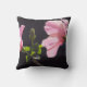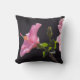 Cor-de-rosa e preto - Este Travesseiro decorativo de 16" é uma forma adorável de acrescentar um toque ousado, mas suavemente moderno, do jardim. A flor de hibisco, na fotografia original de MaeFlowers, no travesseiro, é rosa-borbulha contra fundo quase preto. A foto é um perfil da flor na floração do cheio, com suas pétalas ruborizadas e o caule amarelo de pólen. A luz do sol brilha através das folhas primavera verdes, e um novo botão floral emerge. O outro lado do travesseiro mostra a vista de cheio da segunda flor, atrás da flor em perfil.