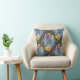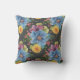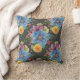 O design de travesseiro floral bonito tem grandes flores azuis primárias pintadas com flores menores em amarelo-marigold, roxo e rosa, todas sobre uma cinza de carvão que lhe dá um aspecto escuro e elegante.
