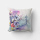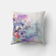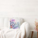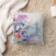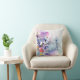 Um bonito travesseiro decorativo personalizado com a imagem de aquarelas florais em tons de roxo, lavanda e rosa com seu nome em uma bela fonte de script.