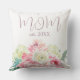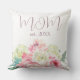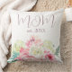 Este travesseiro personalizado apresenta um tema floral saudável. Um buquê de flores cor-de-rosa e brancas é colocado no fundo. O título da mãe é impresso em uma letra escrita manuscrita com o ano estabelecido.