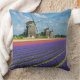 Travesseiro decorativo com as flores roxas e cor-de-rosa do jacinto e os três moinhos de vento em uma paisagem na região do bulbo nos Países Baixos.