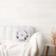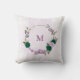 Lindo travesseiro romântico com flores esmeralda verdes e roxas e algumas folhas.