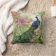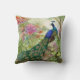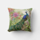 Travesseiro decorativo de decorador com a pintura antiga de um pavão elegante azul e verde numa floresta exuberante de floral e verde cor-de-rosa.