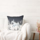 Um travesseiro decorativo preto e branco que apresenta uma floresta de pinheiros oriental fundida em carvão com um cavalo branco selvagem trotando pela paisagem do céu noturno nevado. Um travesseiro moderno incrível com gráficos de qualidade e composição.