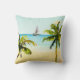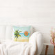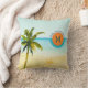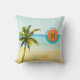 Uma cena pacífica de aquarela do céu, mar e areia mostra uma praia na Flórida com sua majestosa palmeira e nosso logotipo para "Flórida... onde o sol vive". As cores predominantes são laranja, turquesa, azul, verde e, claro, areia. Há um ponto para o seu dentro inicial de monograma no gráfico solar.. ou você pode inserir outro texto (ou apagar). O reverso do travesseiro mostra um pouco mais de ação, com duas palmeiras e um veleiro à distância sob um céu brilhante e ensolarado.