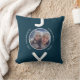 Um travesseiro de Natal moderno e minimalista em azul e branco. Um fundo azul clássico, com a palavra JOY escrita com letras brancas em negrito. A letra O é usada como quadro fotográfico. Personalize e adicione sua própria foto da família, nome e ano.