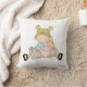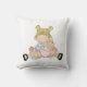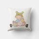 Um travesseiro bonito para o quarto da sua garotinha, com uma garotinha de desenho animado segurando sua boneca que ela está prestes a alimentar com uma garrafa de bebê. As cores são cor-de-rosa, azul, e a menina tem cabelo loiro... a imagem está em ambos os lados da almofada, a cor de fundo é branca.