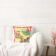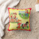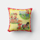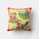 Travesseiro decorativo quadrado com cowboy e cowboy retrorreflectores em um fundo de cheque amarelo com borda vermelha e branca. Esta design também está disponível em outros itens para bebês.