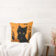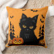 Trabalho de arte de um gato preto empoleirado numa abóbora esculpida rodeada por decoração festiva do Halloween e iluminada por uma lua brilhante e brilhante de cheio. Perfeito para designs sazonais e temas de férias.