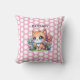 Um gatinho adorável sentado num pedaço de flores azuis e cor-de-rosa e bolinhas brancas, travesseiro personalizado.