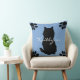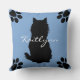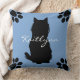 Silhueta de um gato preto do cabelo longo visto da parte dianteira com suas orelhas acima e cauda que olha para fora à esquerda. Quatro patas do gatinho decoram os cantos. Sua nome ou escolha de exposições do texto sobre o centro em um roteiro branco bonito. Mostrado em uma opção azul da cor do fundo. Trabalhos de arte e design por Karlajkitty