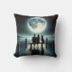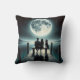 Silhueta de um casal com seu cão pastor alemão sentado em uma doca do lago olhando para a lua de cheio.