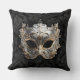 A richly adorned masquerade mask features intricate gold and silver filigree, highlighted by blue gemstones. The ornate design stands out against a patterned damask background.