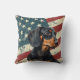 Um belo retrato de aquarela de um cão preto e bronzeado de Dachshund é colocado contra um fundo verde da bandeira dos EUA. Ambos os lados do travesseiro têm a mesma imagem.