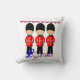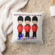 Um travesseiro decorativo tão bonito, branco e azul, London Themed com três pequenas Guardas do Palácio de Buckingham em pé. sob as bandeiras do Union Jack Bunting e sublinhado pelo texto londrino com o famoso símbolo de Londres Eye. Uma imagem muito britânica de diversão e tendências.