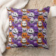 A fun and spooky seamless pattern throw pillow featuring hand-drawn jack-o’-lantern faces in bold orange, purple, and white hues over a geometric web-style background. This bokeh-inspired Halloween design blends cute and creepy vibes.