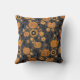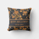 A cute and pretty Happy Halloween throw pillow featuring pumpkin and floral patterns in orange and black, perfect for families looking for fun and modern ways to celebrate Halloween this fall.